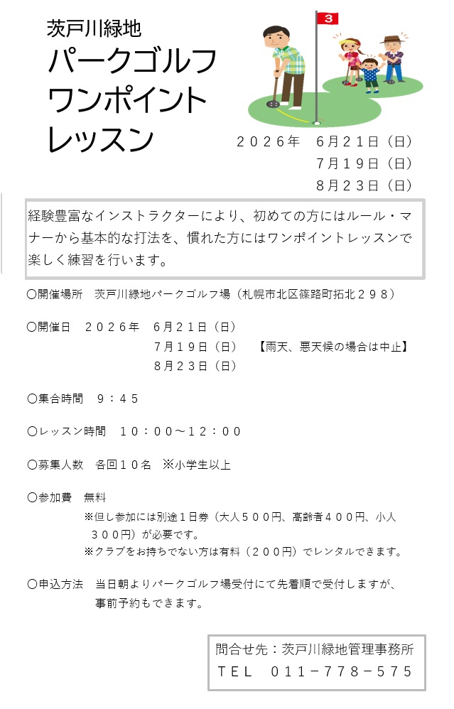 NEW 2026.04.23 # 茨戸川緑地 パークゴルフワンポイントレッスンを開催します いつも茨戸川緑地パークゴルフ場をご利用いただき誠にありがとうございます。パークゴルフワンポイントレッスンを6月21日(日)、7月19日(日)、8月23日(日)に開催いたします。皆様のご参加お待ち申し上げております。 RECENT POST 関連記事のご紹介 NEW2026.04.23 # 茨戸川緑地 パークゴルフ春季大会を開催します 日頃より茨戸川緑地パークゴルフ場をご利用いただき誠にありがとうございます。 下記の通り茨戸川緑地パークゴルフ春季大会を令和8年5月30日(土)に開催いたします。 NEW2026.04.23 # 茨戸川緑地 2026年度 茨戸川緑地パークゴルフ大会のご案内 日頃より茨戸川緑地パークゴルフ場をご利用いただき誠にありがとうございます。 2026年度(令和8年度)の茨戸川緑地パークゴルフ大会の予定をご案内いたします。 皆 2026.03.30 # 茨戸川緑地 腐葉土配布開始日について 日頃より茨戸川緑地をご利用頂きありがとうございます。 2026年度の腐葉土の配布を4月29日(水・祝)の午前7:00より開始いたします。 より多くの皆さんに利用 前の記事 一覧を見る トップページ茨戸川緑地パークゴルフワンポイントレッスンを開催します