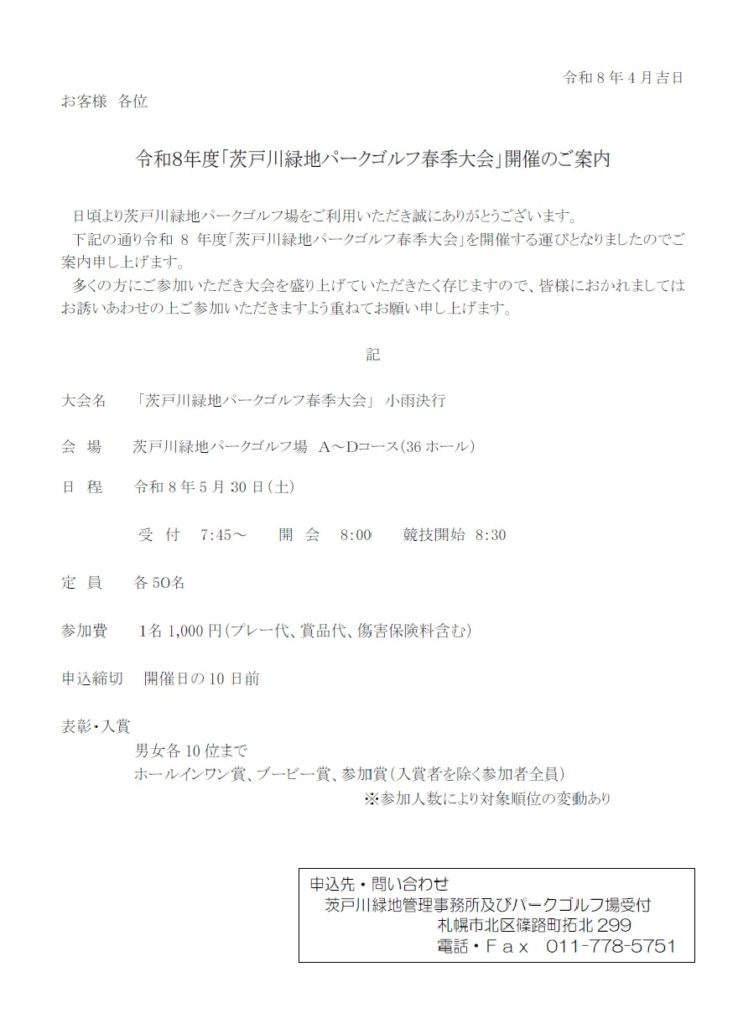 NEW2026.04.23 # 茨戸川緑地 パークゴルフ春季大会を開催します 日頃より茨戸川緑地パークゴルフ場をご利用いただき誠にありがとうございます。 下記の通り茨戸川緑地パークゴルフ春季大会を令和8年5月30日(土)に開催いたします。