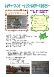 2025.09.27 # 茨戸川緑地 ネイチャーフレンド茨戸川緑地2025~オリジナルのリースを作ろう~を開催します いつも茨戸川緑地をご利用いただきありがとうございます。 10月13日(月)に「ネイチャーフレンド茨戸川緑地2025~オリジナルのリースを作ろう~」を下記にて行います。